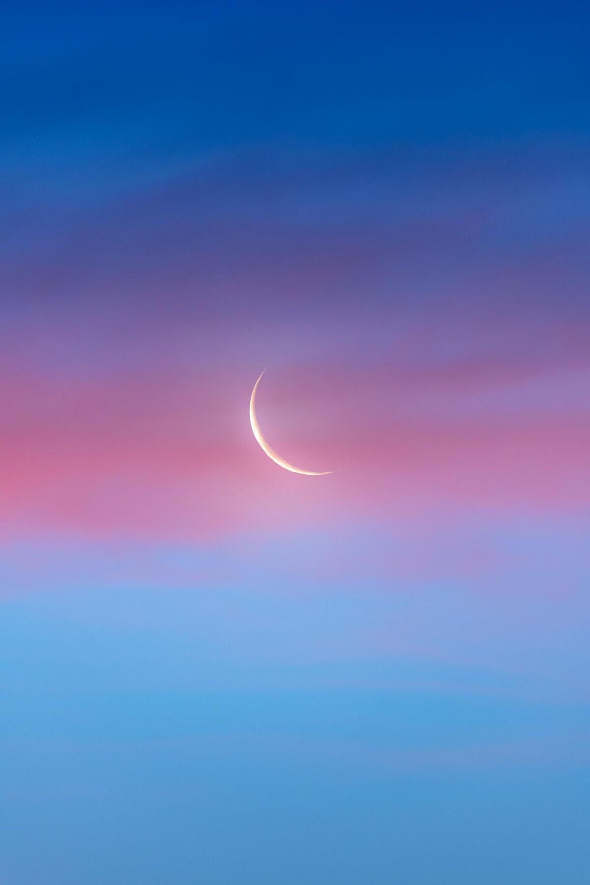 The photo shows a slightly Waning Crescent Moon rising at Dawn, against a beautiful background from the twilight and behind a pink band of clouds, just few minutes before the Sunrise.