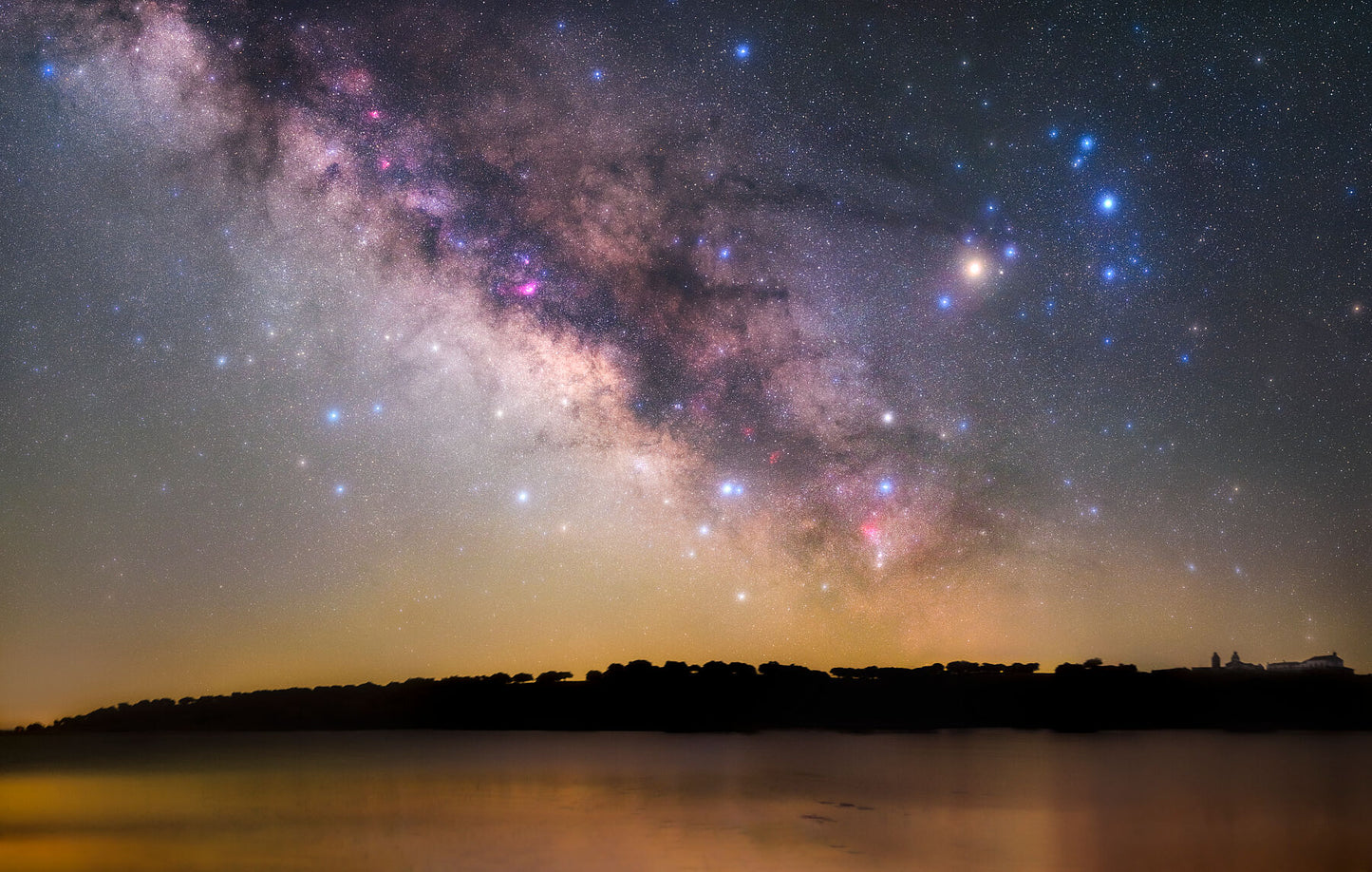 This panoramic shot comprises 8 single images of 1 minute exposure, tracked with the new Polarie U star tracker, taken with a 48mm lens at f2.8. The deep nightscape view captured recently above Dark Sky® Alqueva lake, shows the core of our galaxy full of known deep sky objects, like emission, reflection and dark nebulae, as well as some star clusters. The stars from Sagittarius and Scorpius constellations are shining so bright and colorful. Thanks to a fog filter used in front of the lens, it could help reveal better their colors temperatures.
